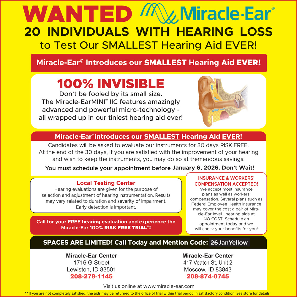 Jan 01, 2026. Miracle-Ear Hearing Aid Center Hearing Ads from Lewiston Tribune