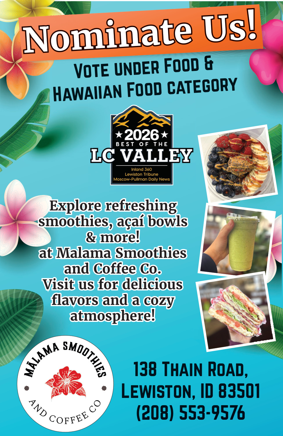 Ads for Malama Smoothies and Coffee Co in Lewiston, ID