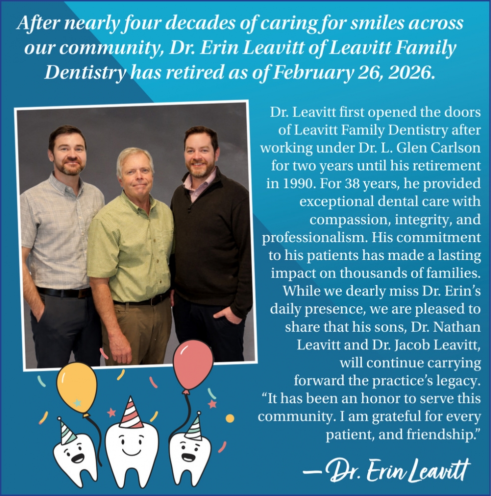 After Nearly Four Decades of Caring for Smiles Across Our Community, Dr. Erin Leavitt of Leavitt Family Dentistry has Retired as of February 26, 2026