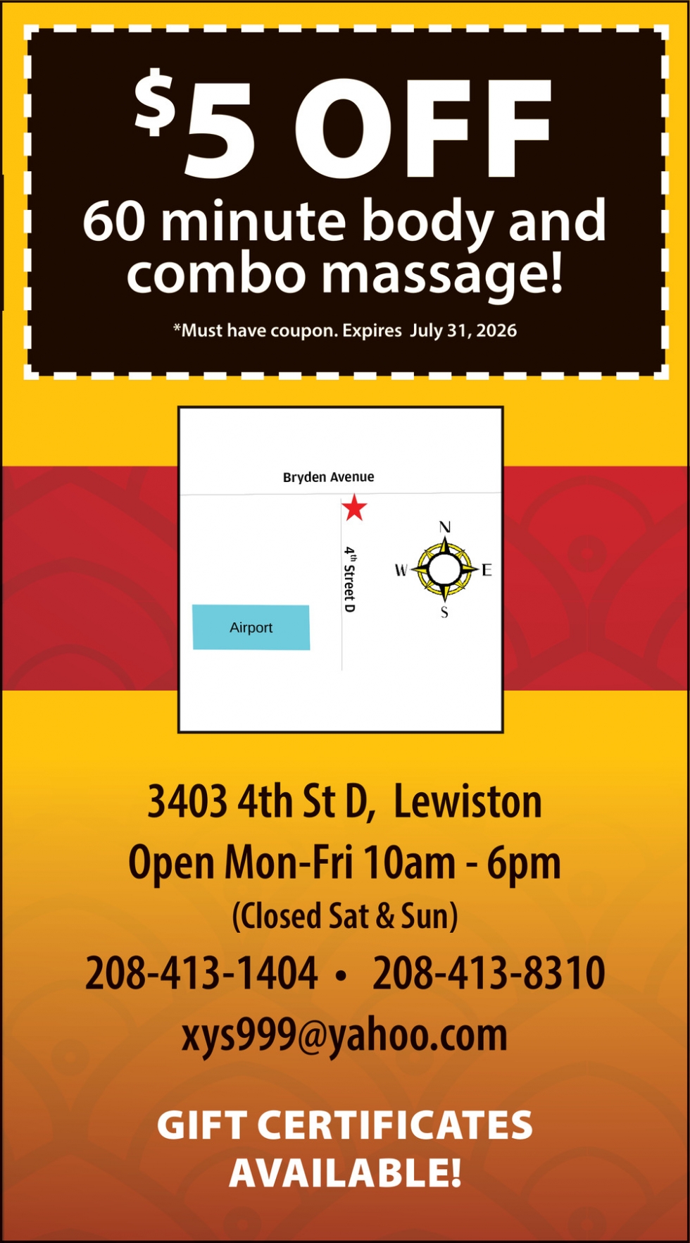 Apr 26, 2026. Airport Foot & Body Massage Health & Wellness Ads from Lewiston Tribune