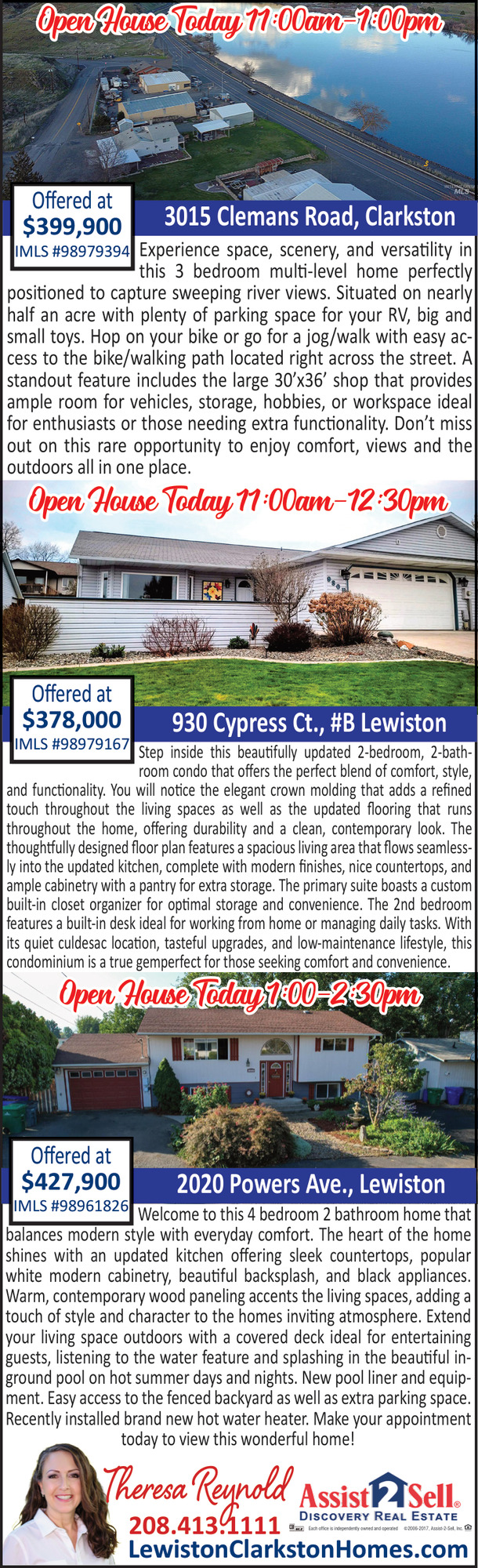 Apr 26, 2026. Assist 2 Sell Discovery Real State - Theresa Reynold Real Estate Ads from Lewiston Tribune