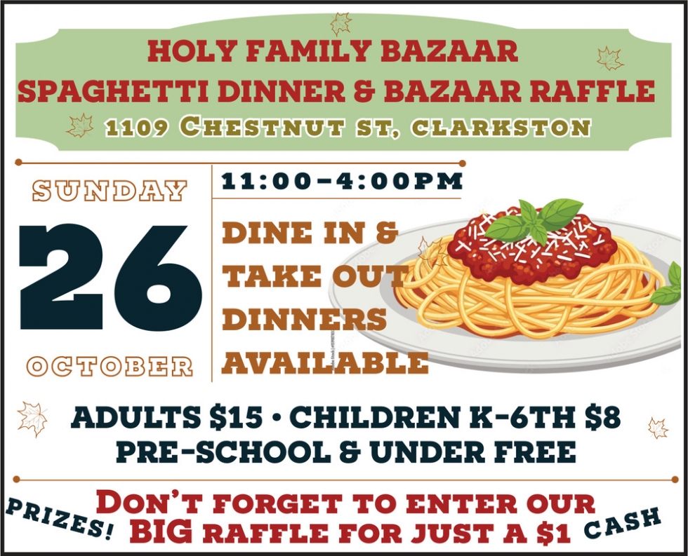 Oct 05, 2025. Holy Family Bazaar - Spaghetti Dinner & Bazaar Raffle Events Ads from Lewiston Tribune